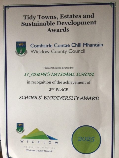 St. Josephβs NS Templerainey was awarded 2nd Place in the Schools Biodiversity Award category. We were delighted to be presented with a certificate and a grant for our school.