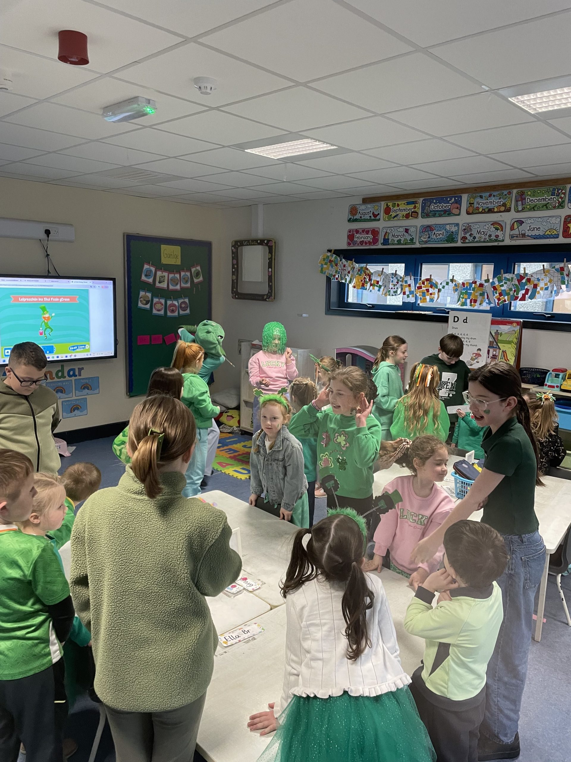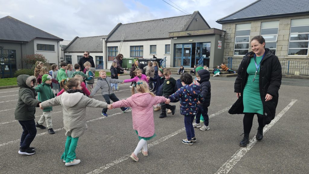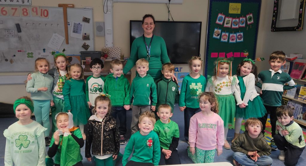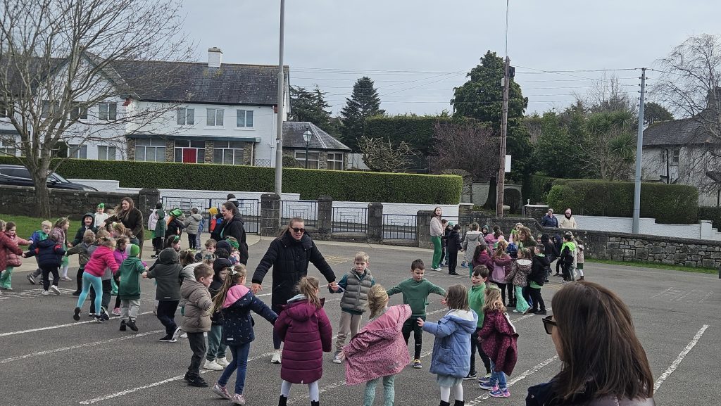 Bhí Seachtain na Gaeilge den scoth againn go léir. Rinne An Coiste an obair, fíor bhuíoch díbh. Ghlac Rang a trí go Rang a Sé páirt i dTráth na gCeist sa halla. Bhain gach duine taitneamh as. D’imigh Rang a dó agus Rang a Trí ar Toraíocht Taisce. Bhí an-chraic acu. Tháinig na hardranganna ar chuairt do na bunranganna chun dánta agus rannta a dhéanamh leis na páistí. Bhí siad ar fheabhas! Ar an Aoine, bhí céilí mór againn sa chlós. Céilí iontach a bhí ann.